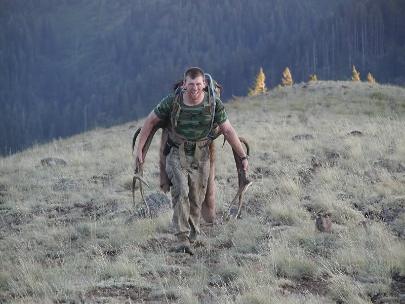 Charlie even got to video the bull yesterday (thursday) and that was super cool! We got to the trail head around 6:15 this evening, hiked in a ways to where we thought we'd be and met Gerry (travis' father) and he was bringing some water and munchies to the guys but wasn't sure exactly where they were located.... So all three of us headed in their direction and come upon BowsNHos with the head/cape on his back! What a way to get pumped! He was the one elected to carry it because he was the tallest guy in camp and the antlers literally drag the ground while on anybody elses back!!