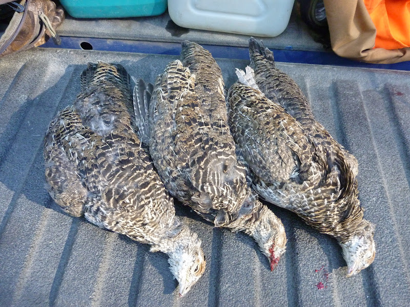 After hitting the usual "spots" that during good years produce limits in the first hour and not seeing a whole lot we hit some "new" ie never had to hunt them before draws and found some birds, figured out what they were eating and the side of the mountain they liked and the hunting got pretty good, was able to put a few in the cooler every morning after that.